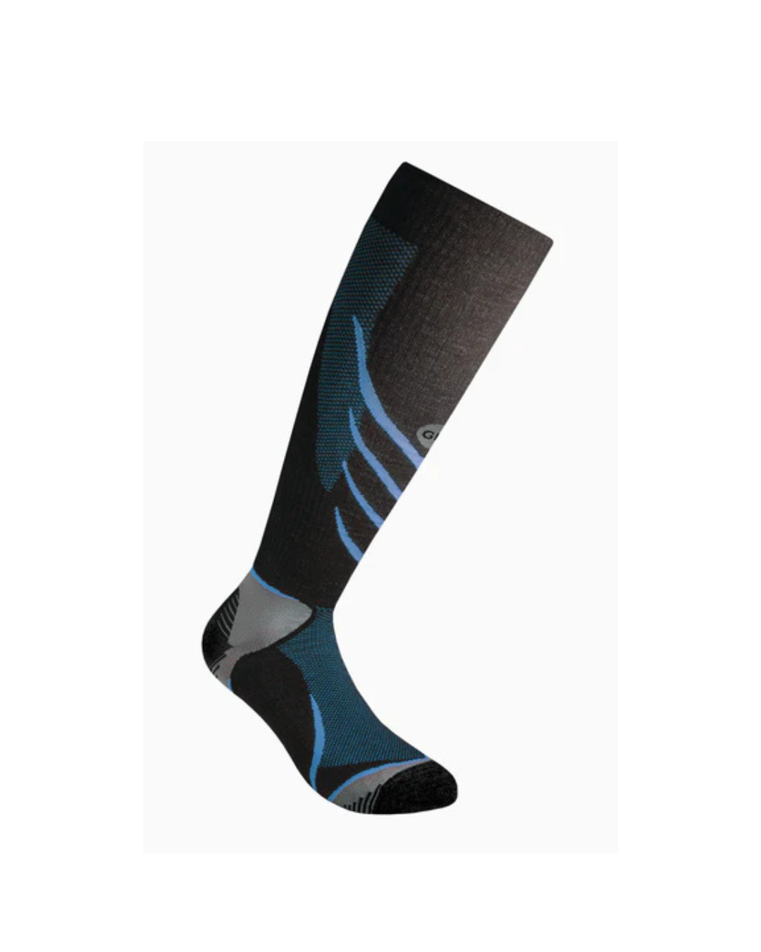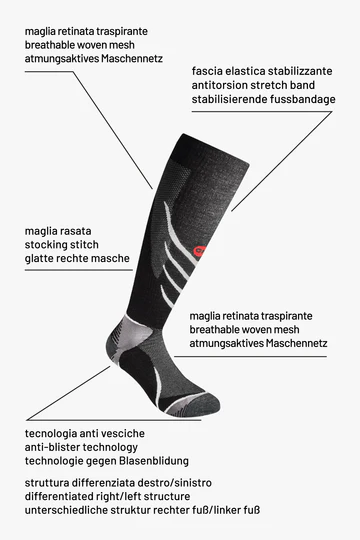 Progettata per le gare di scialpinismo, per gli allenamenti e le salite veloci sugli sci, questa calza rappresenta la sintesi perfetta del delicato equilibrio tra leggerezza e resistenza. È realizzata con un blend di lana merino per la massima termorego- lazione e filato tecnico per un’eccellente durabilità. La costruzione ergonomica consente di avere il minimo spessore della calza, regalando grande sensibilità al piede negli scarponi da light touring, pur mantenendo la massima resistenza soprattutto nei punti di maggiore stress. Ampi pannelli in rete sul polpaccio, sull’arco plantare e sul dorso del piede favoriscono la traspirazione. Uno speciale elastomero avvolge tutta la calza rendendola molto fasciante per un’ottima stabilità sul piede e sulla gamba. Il tallone e la punta sagomata per il piede destro/sinistro sono realizzati in tessuto NanoGLIDE con funzione antivesciche.