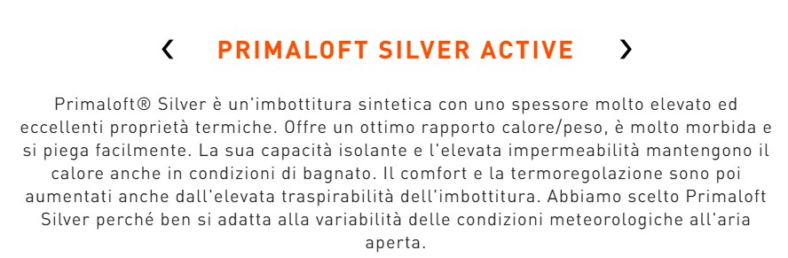Realizzata con costruzione ibrida il tessuto K-Dry regala a questa giacca un’impermeabilità pari a 20.000 colonne d’acqua e 70.000g/m2/24h di traspirazione mentre inserti in tessuto Thermo Fleece, nel cappuccio, sui polsini al fondo manica, all’interno fondo manica e nell’interno schiena donano comfort e termicità. Termicità garantita, principalmente, dall’imbottitura in Primaloft® Silver Active100 su maniche e cappuccio mentre da 130 grammi sul resto del capo.