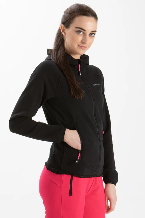 Scopri la versatilità della nostra felpa con zip, tasche e cappuccio, pensata sia per l’attività sportiva che per semplici passeggiate in montagna. Questo modello è realizzato in un tessuto leggero ed è completo di due tasche laterali con zip e fondo e polsini elasticizzati che offrono comfort e praticità in ogni occasione.